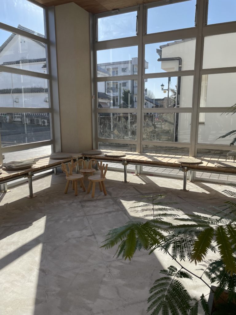 そしてみんながくつろげる縁側っぽいベンチは足場に使う素材を使用
